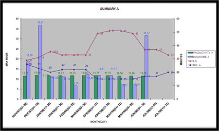 Desse modo, observando a diferença entre a produtividade bruta e a líquida, sabíamos que a diferença era a ociosidade (desperdício da mão de obra) e quantas horas eram gastas para se produzir uma unidade. Essa análise era feita por todos os setores diariamente.