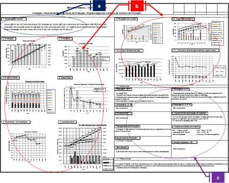 O Departamento do PCP, com base nos dados e indicadores de todas as áreas, elaborava um A3 mensal (ver figura 6), o qual era enviado para a matriz e para as diretorias envolvidas.